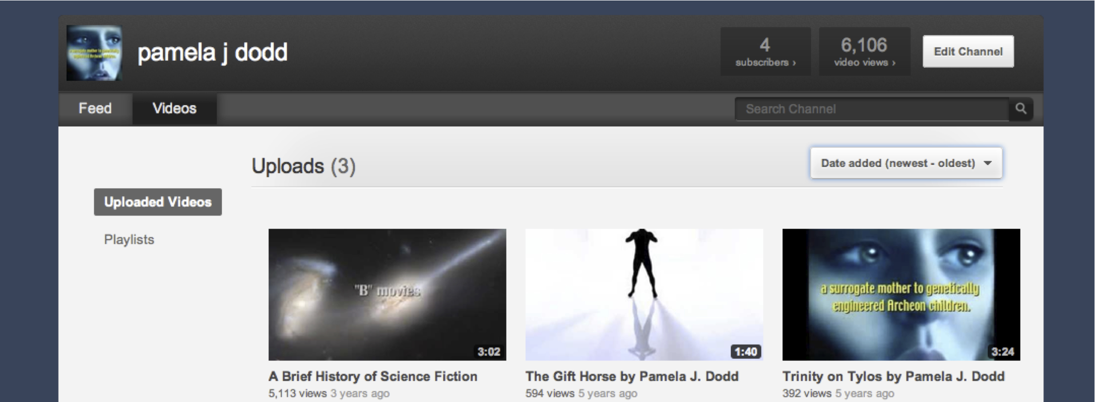 My third video was my first attempt at three channel video making: In addition to a music track, I recorded myself reading a script. Then I had to put the video together. For me, that was an arduous task, perhaps because so much time had gone by since I took the class. However, this third video needed a title, and I gave the matter about fifteen seconds of thought and used “A Brief History of Science Fiction.” In my mind this is lazy; I obviously adapted the title of Stephen Hawking’s brilliant work, A Brief History of Time. The title proved to be much more successful than the ones I chose for my books, because this video has been viewed over five thousand times. Of course its success may be because it is a bit more ambitious.